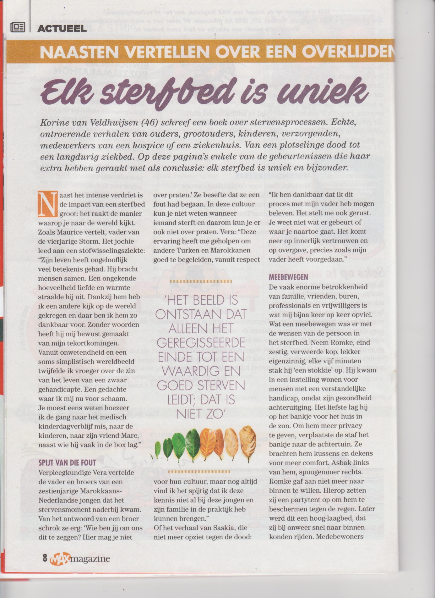 Een groot artikel over Aan het sterfbed in MAX Magazine van deze week (42)! Fijn, deze aandacht voor dit boek, waarin zoveel mensen hun verhaal over de laatste levensfase van hun naaste hebben gedeeld. Dat hun verhalen troost, hoop, moed, herkenning én vertrouwen mogen bieden! Wil je het artikel lezen, klik dan op de woorden Artikel MAX Magazine.