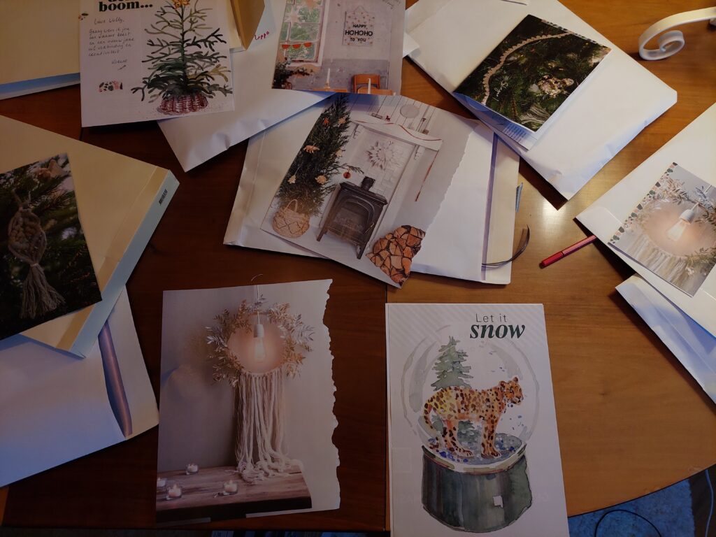 Het was ons eerste digitale kunstenaarsuitje… Dit vroeg om extra voorpret en daarom kregen de Schrijfgroepers voorafgaand aan het uitje een dikke envelop in de brievenbus met lekkers, leesvoer, een waxientje en bovenal artistieke attributen om deze creatieve uitspatting op de eigen plek mogelijk te maken. Sommigen schrokken van de aquarelverf en het penseel: ‘Ik kan helemaal niet schilderen’, anderen verheugden zich daardoor extra. En zo vouwden, knipten, lazen, zagen, schilderden, verbeeldden en verwoordden we op vrijdagavond 10 december wat er wilde komen en verscheen pagina voor pagina de leporello, een harmonicaboekje. Dit alles onder de bezielende begeleiding van kunstenaar en oud-Schrijfgroeper Stephanie Ming.