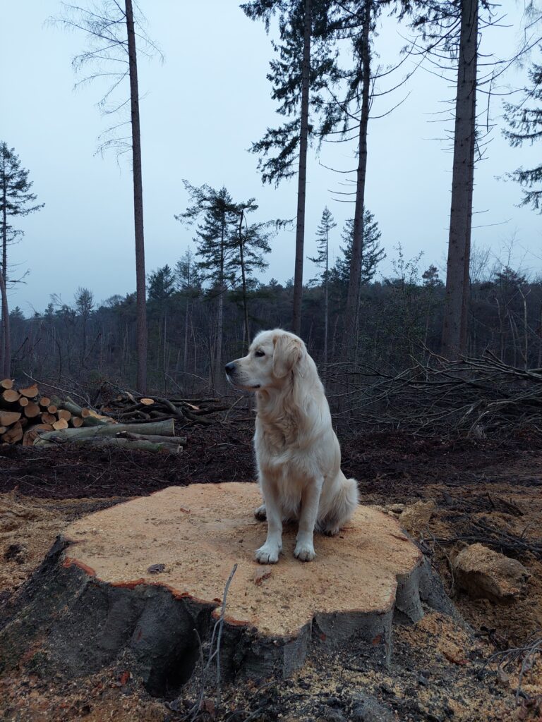 En dan onze hond: dolblij is ze dat ze het haar vertrouwde bos weer in kan. Zo veel nieuws te ruiken.